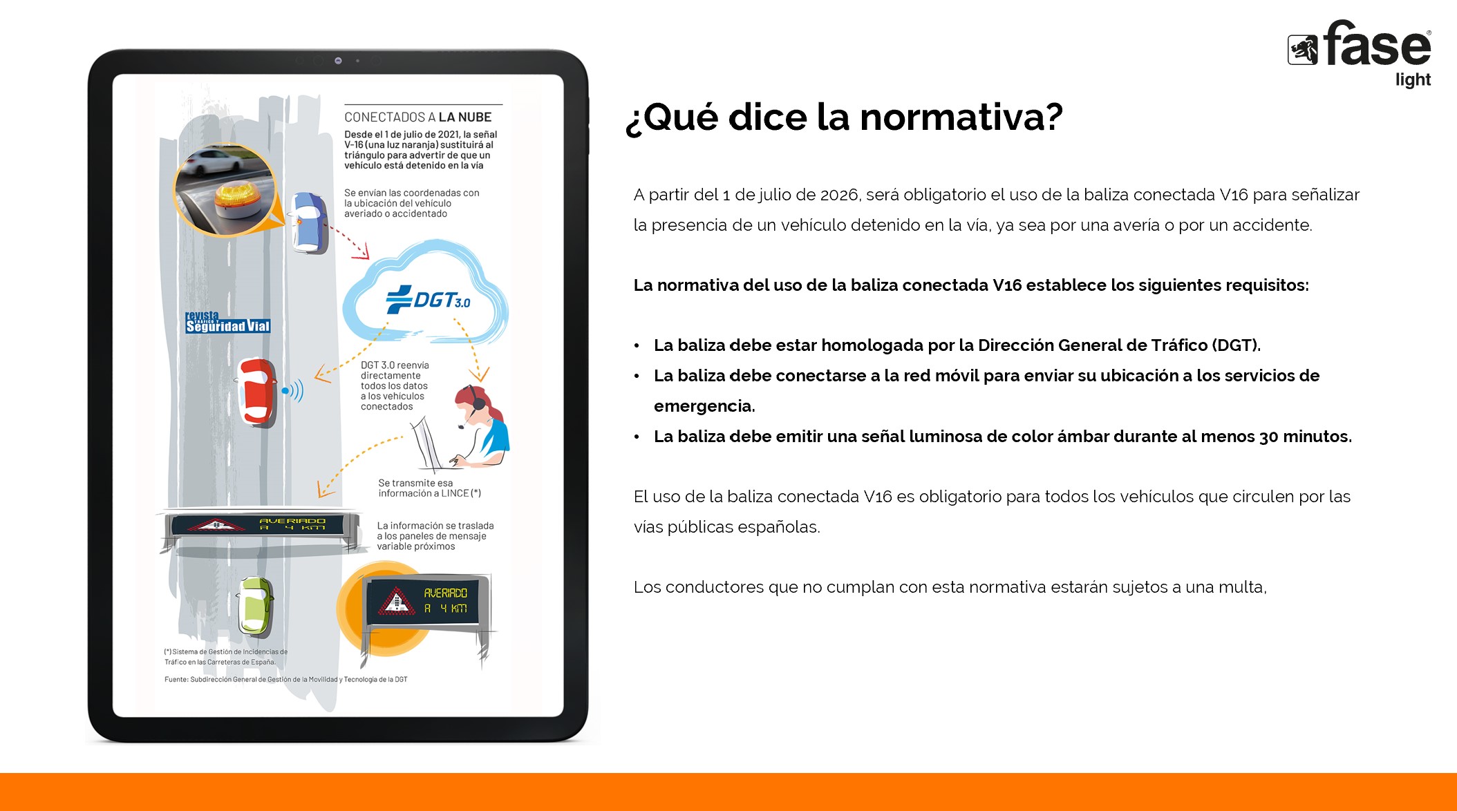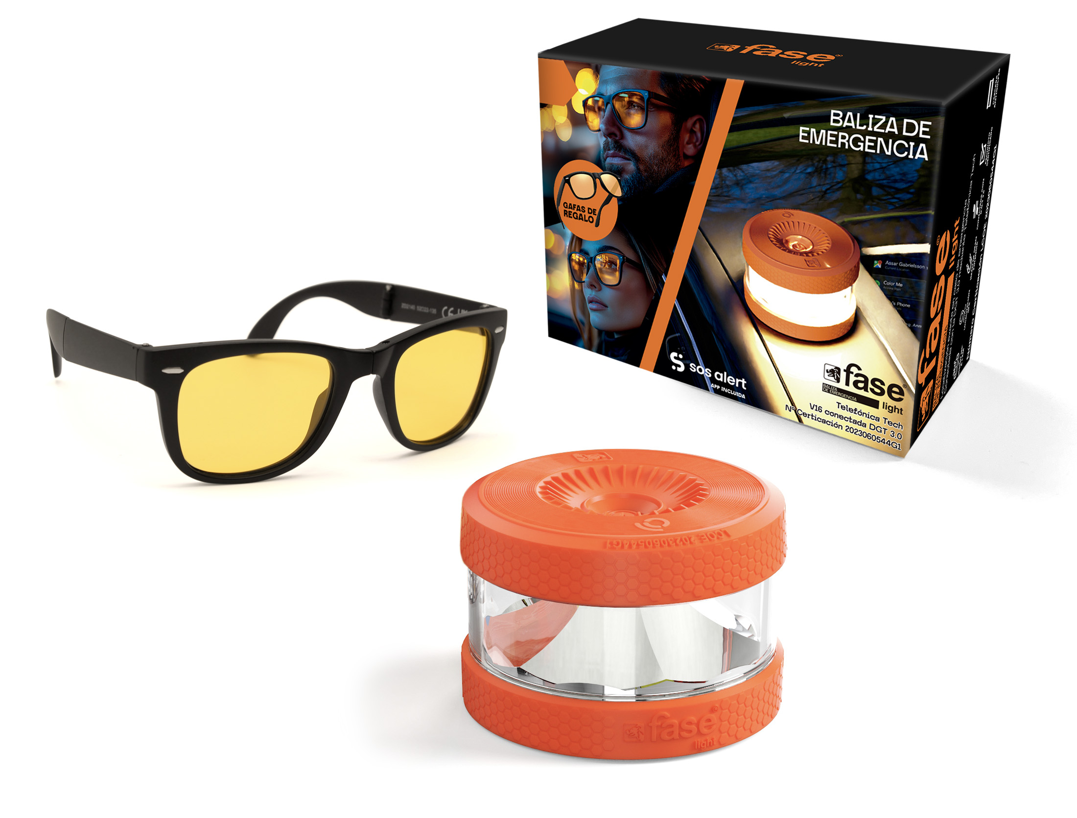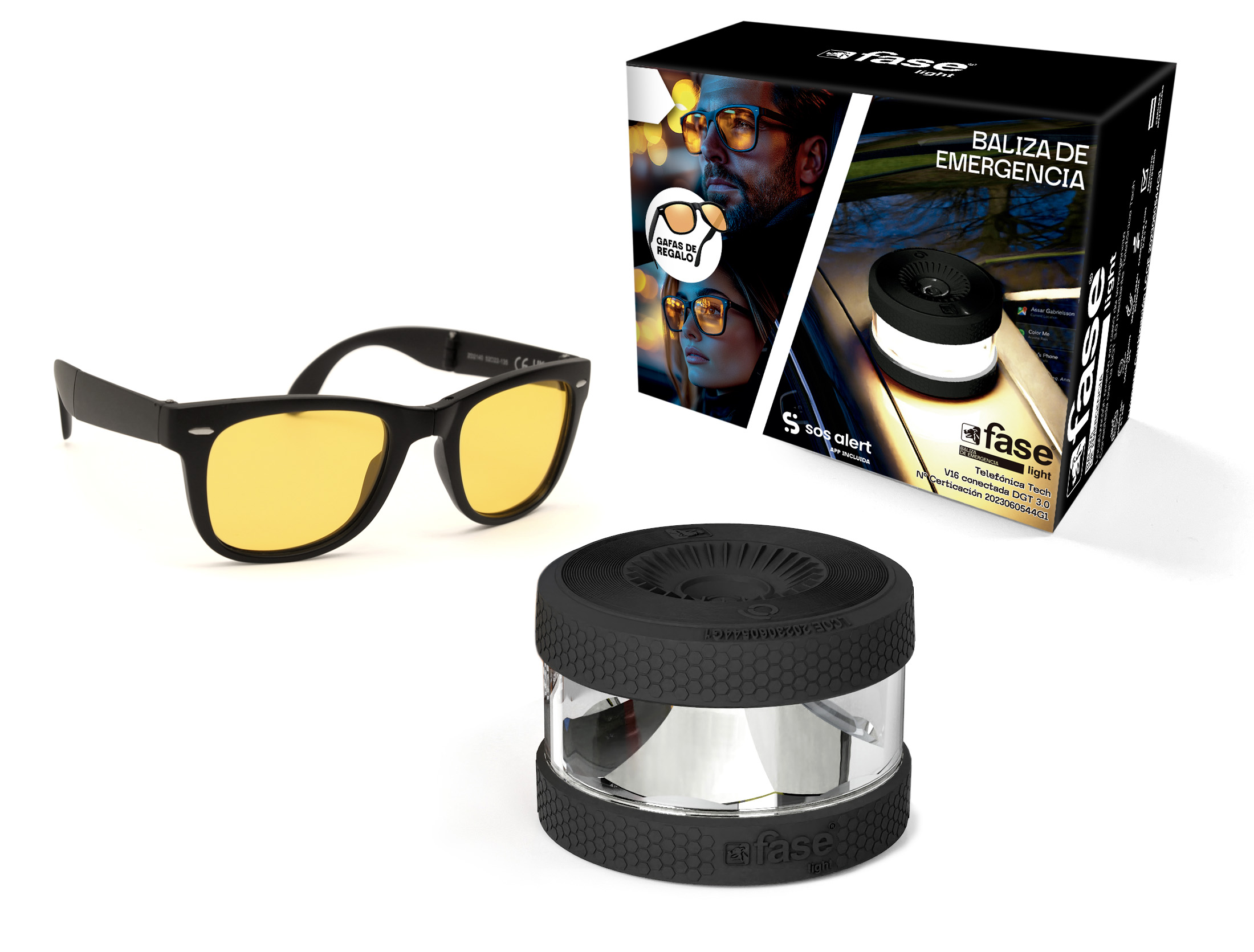 Baliza homologada V16 geolocalizable con conectividad Telefónica NB-iot - Marca FASE LIGHT IoT. App SOS ALERT incluida Luz de emergencia para señalizar el vehículo en caso de accidente o avería. Señal V16 homologada. Aporta geolocalización exacta y anónima a la DGT 3.0 en caso de peligro o incidente en carretera. Obligatoria a partir del 01/01/2026. SEÑAL DE EMERGENCIA: Fase Light es un dispositivo de señalización de emergencias en carretera. En caso de sufrir un accidente o una avería, gracias al alcance de su potente luz, esta baliza hace visible tu vehículo averiado para ser visto por otros conductores desde 1 km de distancia y 360º Esta señal luminosa V16 cumple con los requisitos de homologación que exige la Dirección General de Tráfico, incluida la conexión que permite avisar de la posición del incidente, de forma totalmente anónima, durante 2.30h. Con este sistema la DGT alertará a otros conductores para que tomen precauciones al pasar por tu ubicación. eSIM ANÓNIMA: Este dispositivo incluye un plan de datos de Telefonica Tech de más de 12 años de validez, hasta el 1 de enero de 2038. Cuenta con una tarjeta virtual de datos incorporada que es completamente anónima y te permitirá estar conectado solo para alertar de incidentes, sin referencias personales. La tecnología Narrow Band de Telefonica le aporta gran cobertura. SUSTITUYE AL TRIÁNGULO: Esta baliza V16 sustituye a los triángulos de emergencia con el objetivo de mejorar la seguridad y evitar el riesgo de atropello en carretera. La baliza Fase Light se coloca sin necesidad de abandonar el vehículo, evitando al conductor invadir la calzada para señalar el incidente y salvando vidas. Gracias a su potente imán queda sujeta al techo del vehículo fácilmente. GAFAS DE CONDUCCIÓN NOCTURNA: Mejora tu visión al volante con estas gafas plegables de conducción nocturna. Reducen la fatiga visual, aumentan el contraste, mejoran la claridad y minimizan reflejos y deslumbramientos. Ideales para una conducción más segura y cómoda en condiciones de poca luz.